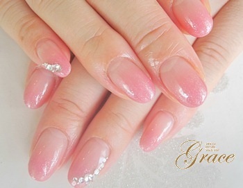 ベーシックなクリアベースのグラデーションに華やかなストーンの組み合わせネイルです。