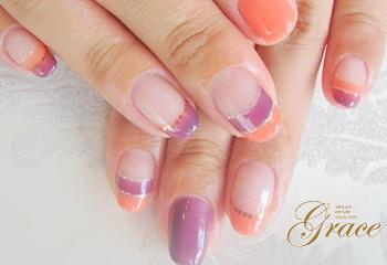 カルジェルNo.8のオレンジ&No.50のパープルをフレンチやWフレンチ&カラーの一色塗り。