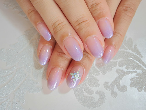 上品なラベンダーパープルのグラデーションです。 ワンポイントのストーンで華やかに仕上げています。