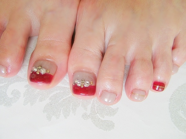 今秋、流行色といわれている「ボルドー系カラー」を取り入れたフットジェルネイルです。