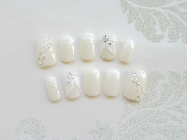 純白のウエディングドレスにも様々なカラードレスにも合う ホワイトのネイルチップです。 今回の花嫁さまはイエローのカラードレスに合わせさせていただきました。