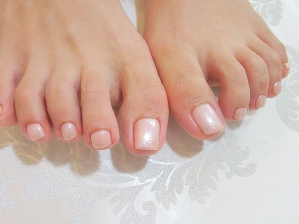 オーダーネイルチップと同じカラーとラメのフットジェルネイルです。 ブライダルネイルではフットとハンド、お揃いも人気です。