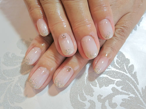 ピンクのワンカラーに爪先はラメカラーネイルです。