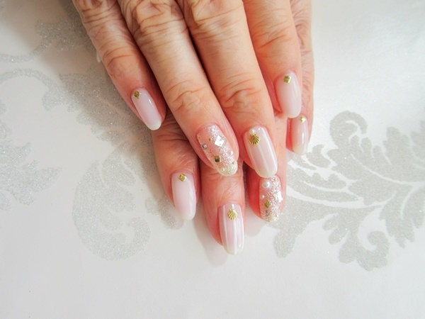 夏ならではの貝殻にパールを合わせて上品な大人の夏ネイルデザインです。
