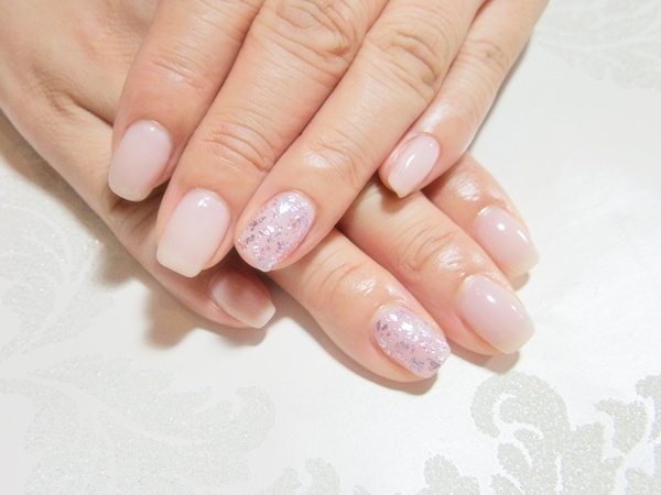 透明感がある薄いピンクのヌーディカラーです。 薬指にはカラー箔を入れています。