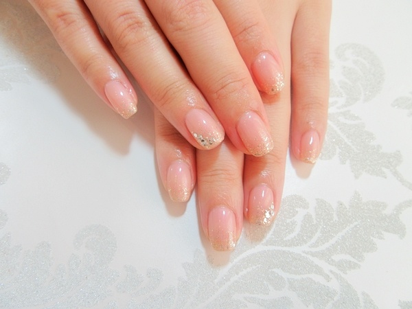 ピンク色のドレスに合わせたパーティ仕様のネイルです。 肌馴染みのいいピンクをベースにゴールドのラメを散らして 少し華やかに仕上げています。