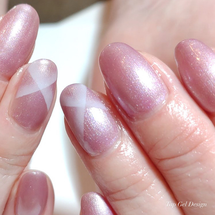 青みピンクのワンカラー(一色塗り)です。 ネイルアートは両手薬指に「タップグラデーション」で斜めラインを入れました。